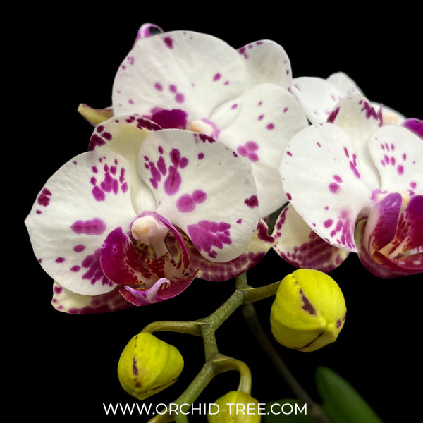 Phalaenopsis OX Princess is a hybrid phalaenopsis with fresh white flowers and lots of markings in red, the markings could vary from flower to flower. The flowers are placed closely on the inflorescence, creating a beautiful display. This phalaenopsis orchid is a hybrid of Phal. OX Lion King × Phal. OX Queen.